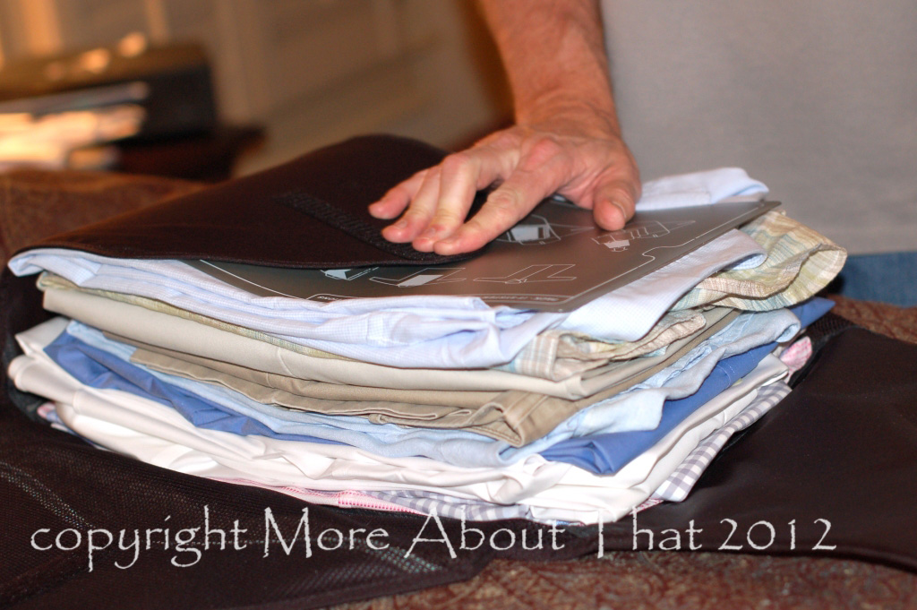 With the Pack-it Folder, they provide an easy to follow folding mat that shows you exactly how to fold your shirts, dresses and skirts so that they are all the same size. You fold each one and stack them on top of each other. As you stack them, you slide the mat out of the item on top to use for the next item.