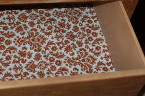 The fabric drawer liner project is complete! I stopped by the fabric store on Saturday and picked up some fabric at 30% off and they also had the fabric stiffner. I cut the fabric into four smaller pieces. I used a large mixing bowl to dilute the fabric stiffner. Don’t follow the directions on the bottle! Follow the directions from the blog link on BlueEyedYonder. She recommended diluting the stiffner much more than the directions on the bottle and this is important. You only need the fabric to be slightly stiff. If you use too much of the product the fabric is very difficult to iron flat and it is just too stiff. The picture above is the finished product!