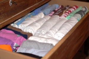 My inspiration for this project is from my friend Laura. Laura is one of the few people that may be more organized than me!! It is a sickness really but it works for me. Laura sent me a few pictures of the way she organizes her dresser drawers by rolling everything instead of stacking. I had always previously used the stacking method but when you stack, you can’t see what is underneath. With the ‘rolling’ technique, you can see everything in the drawer clearly and things just slide in and out without disturbing the entire stack.